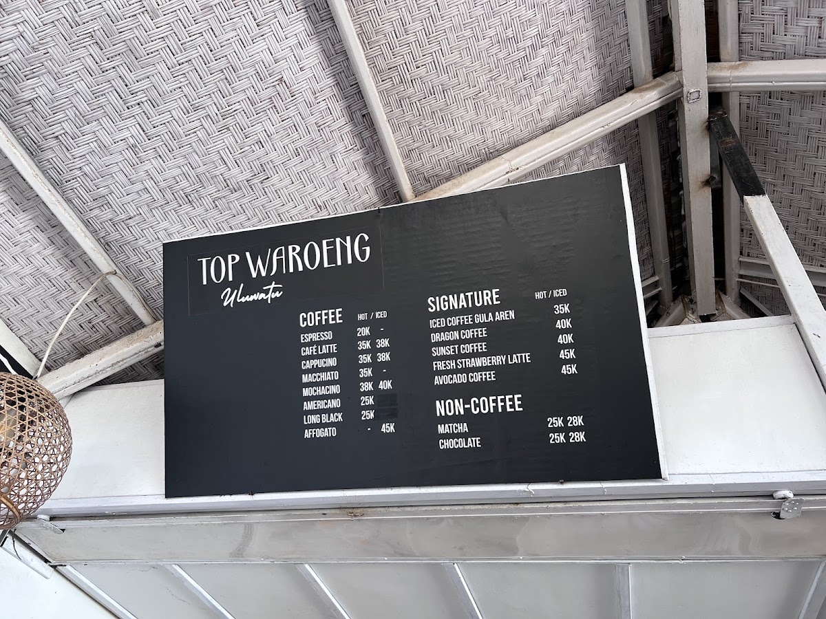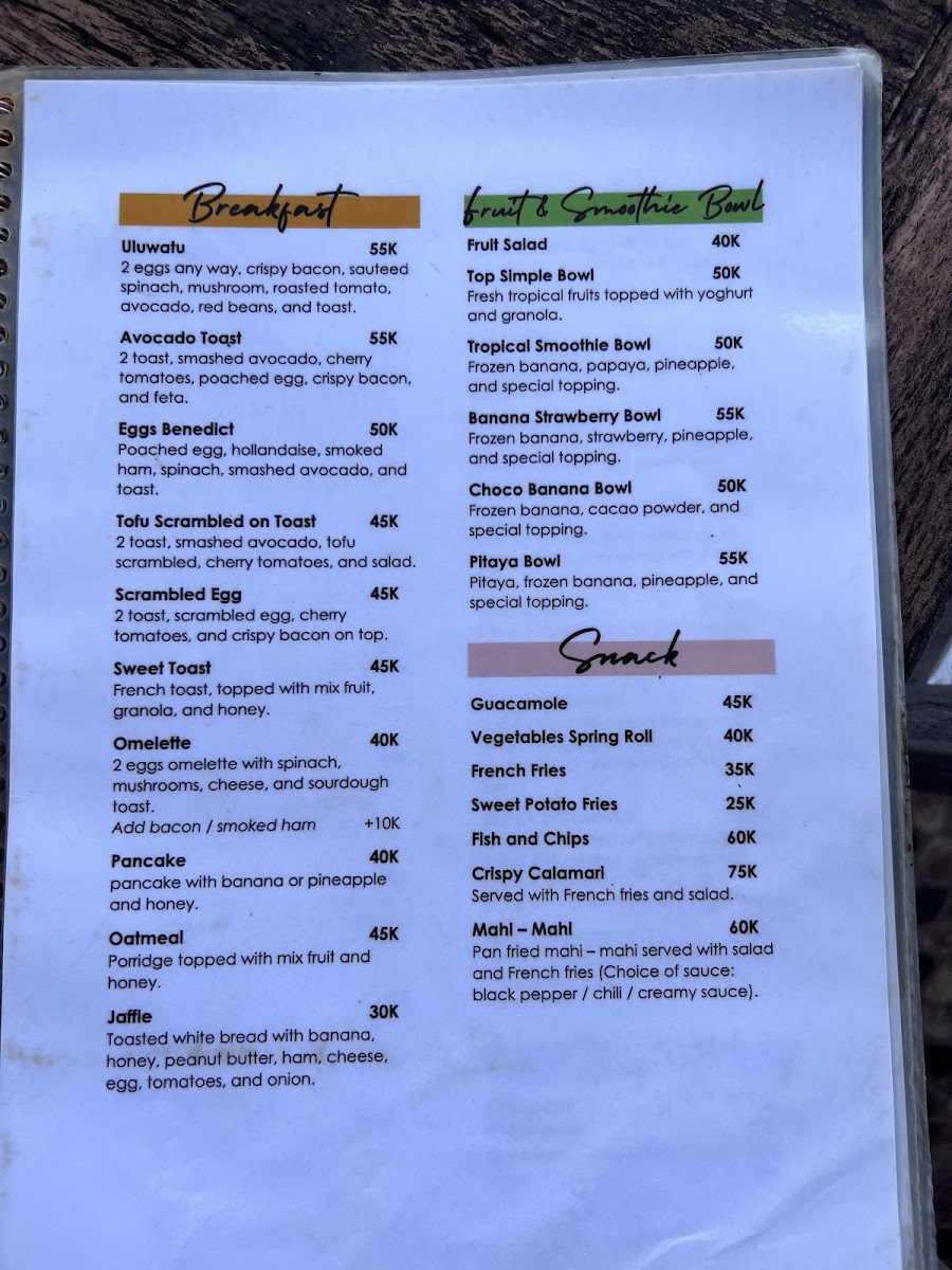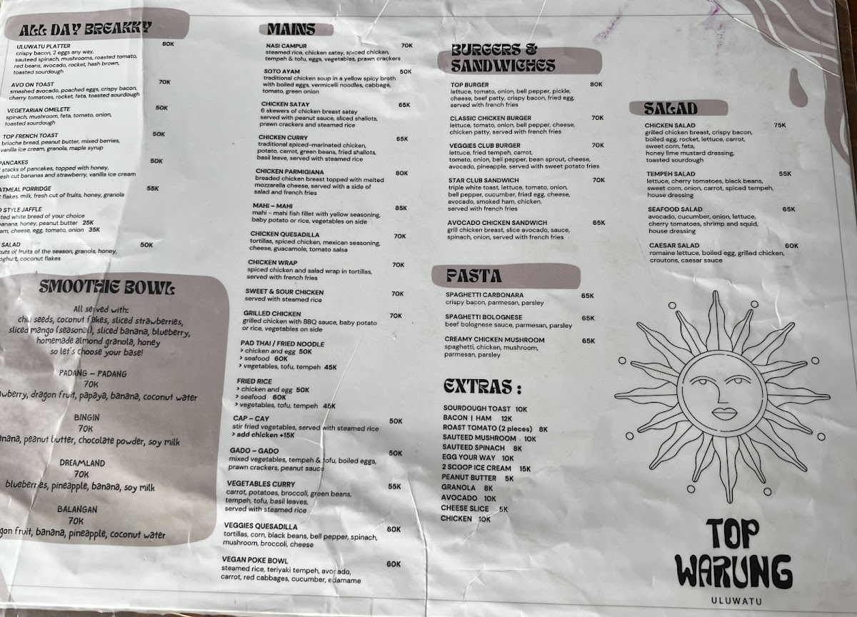 The menu at Top Warung Uluwatu offers a selection of food and beverages suitable for breakfast, light meals, and casual dining throughout the day. While specific dishes are not detailed here, customer feedback indicates the availability of traditional Indonesian options such as Nasi Goreng and Pad Thai noodles, alongside popular breakfast items like avocado toast.