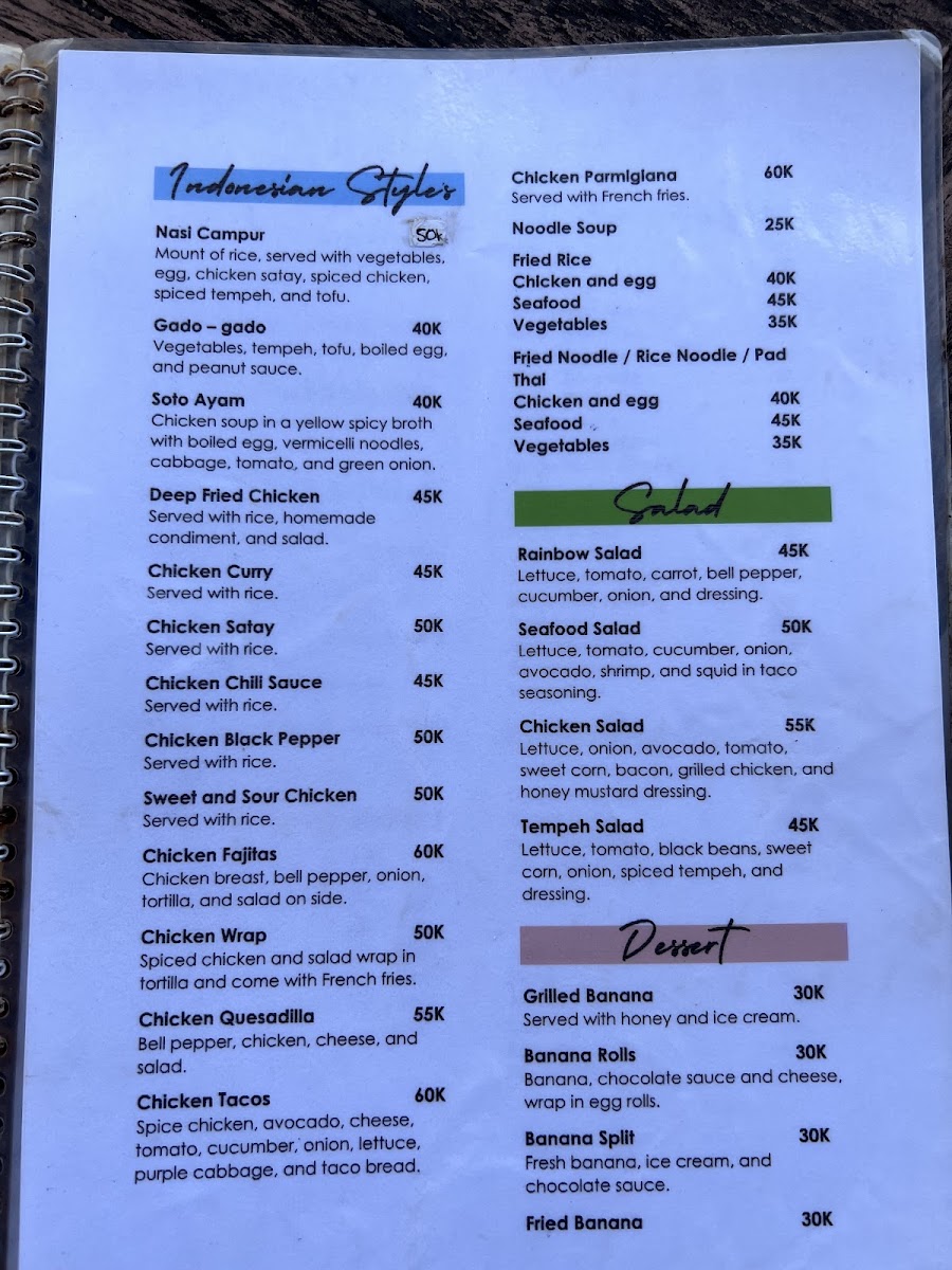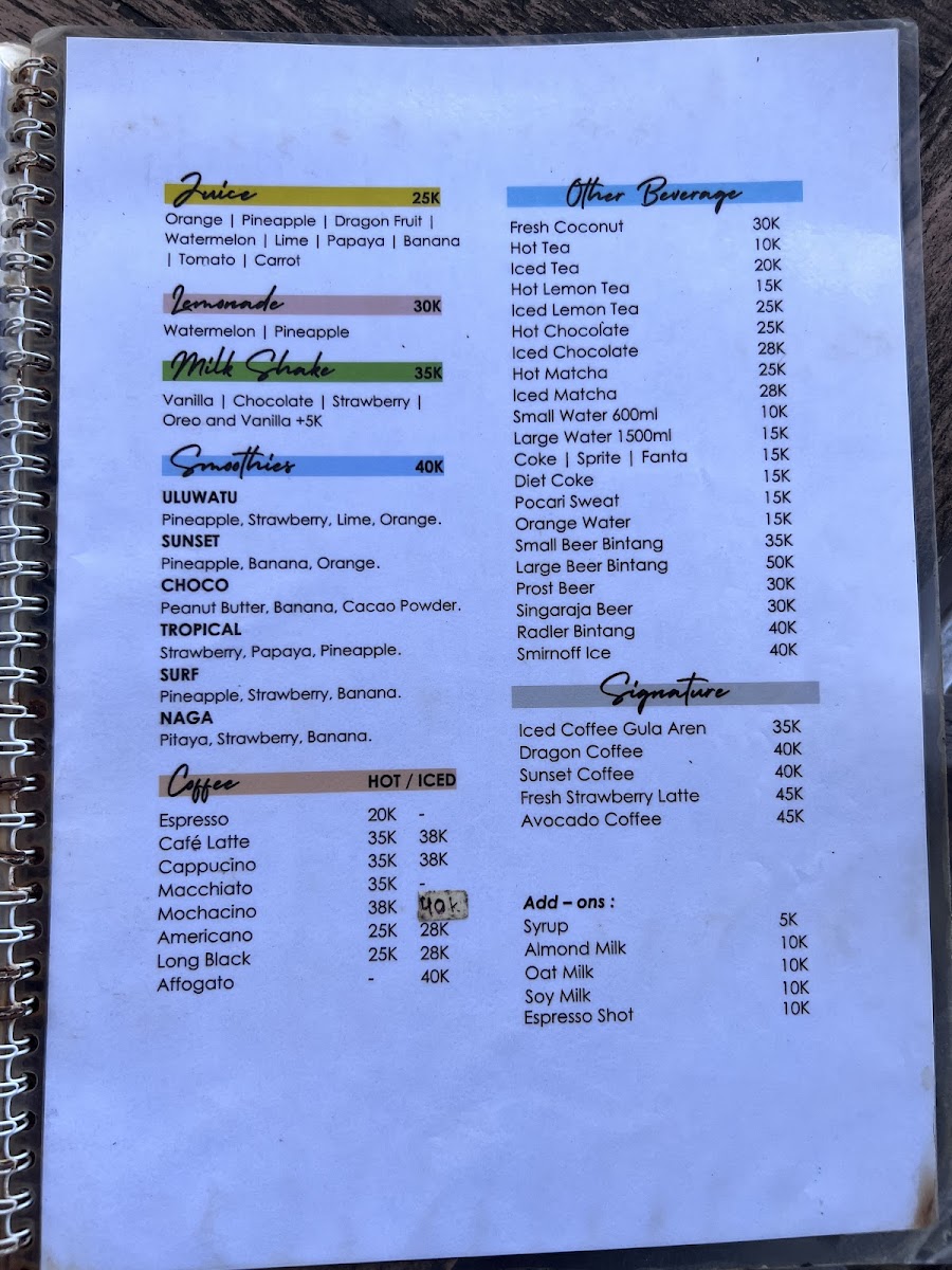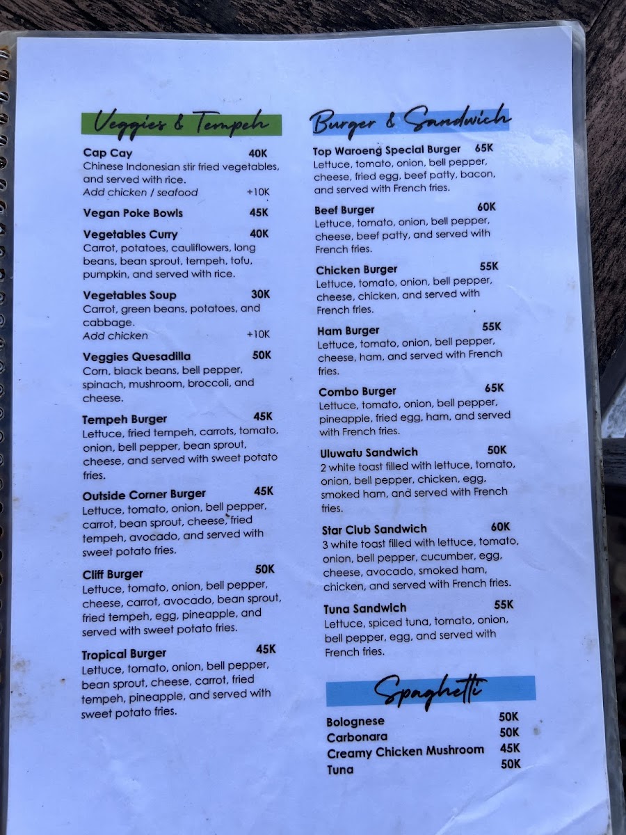 The menu at Top Warung Uluwatu offers a selection of food and beverages suitable for breakfast, light meals, and casual dining throughout the day. While specific dishes are not detailed here, customer feedback indicates the availability of traditional Indonesian options such as Nasi Goreng and Pad Thai noodles, alongside popular breakfast items like avocado toast.